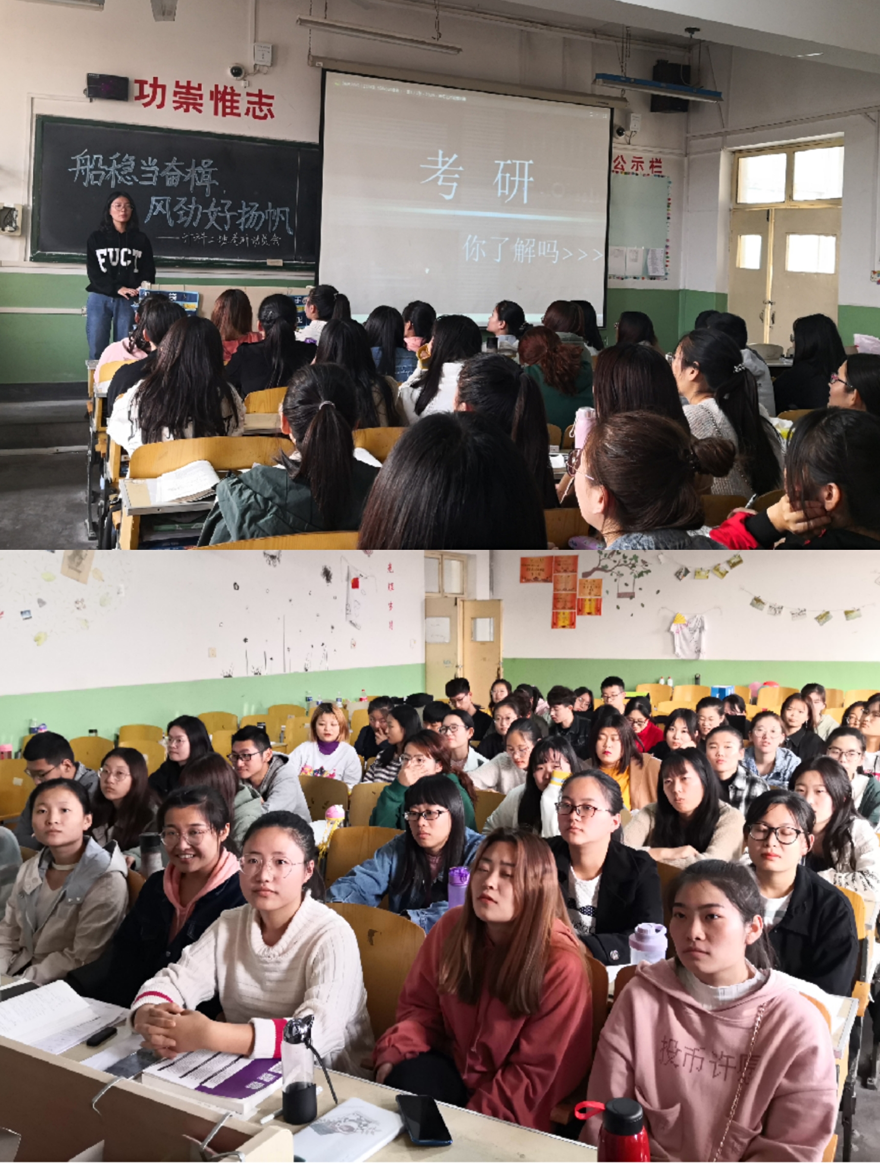 为了使2018级计算机科学与技术2班的同学有更广阔的知识和见解,提升自身能力,鼓励同学们有更高的学术追求,调动考研积极性,使学生的未来拥有更广阔的前景, 10月21日下午在第一教学楼413教室,2018级计算机科学与技术2班团支部组织全班同学举办了主题为“船稳当奋楫,风劲好扬帆”的考研动员会。