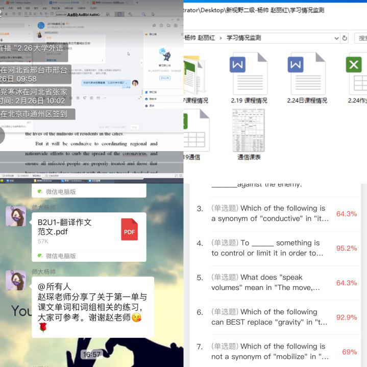 服从命令,提前规划。在2月5日,距离线上教学正式开始前近两周,赵琛老师加入了新视野二级课程组,在师大本部杨帅老师的带领下,与其他老师一起出谋划策,提前备课。首先学习了线上教学工具,学习通、钉钉、U校园的使用方法,与此同时,也积极完成第一单元的备课任务。为了保证开学第一天课程的顺利进行,赵琛老师提前与学生测试线上教学平台的功能,并制定了两套教学计划,以防其中某个平台出现卡顿等意外。