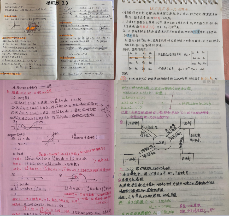 评比活动开展以来,全体学生参与,收到参评笔记图片1300余张,包括英语、高等数学、线性代数、计算机导论和C语言程序设计等多门基础课程,笔记内容充实,多形式地展现了不同学科的独特风采。郭晓芸根据笔记的内容结构、条理逻辑、形式创新和实用程度等标准来对笔记进行评定,最终评选出405张最佳笔记图片。一份份精美笔记字迹工整、图案精美,清晰而有条理的排版将重点与难点明显区分开来,充分展现了学生良好的学习习惯。