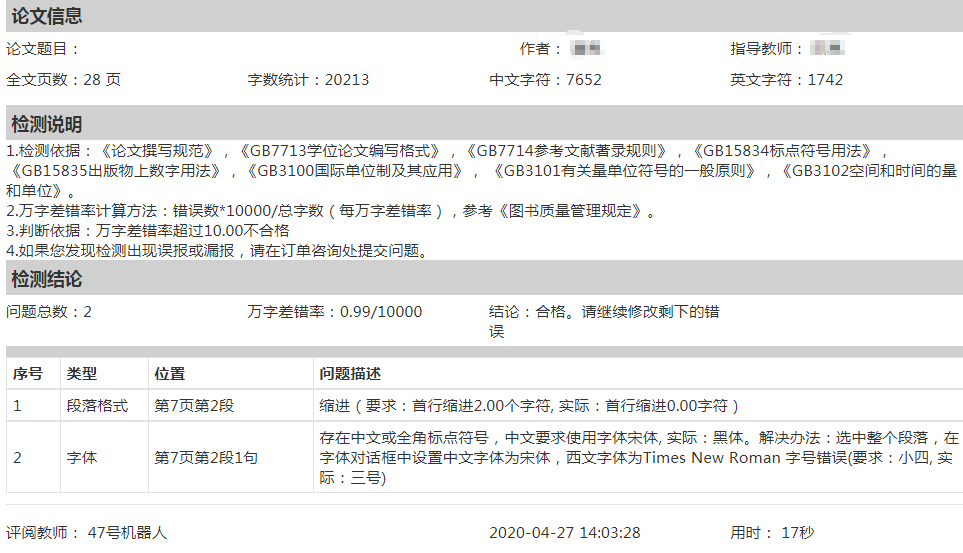毕业论文是实现本科培养目标要求的重要组成部分,是大学期间学生毕业前的最后学习和综合训练阶段,是对学生综合素质与工程实践能力培养效果的全面检验,也是毕业资格认定的重要依据。该项举措的实施,可以使得论文格式校对及审查工作得以极大简化,原本需要耗费师生大量时间反复校对格式的工作仅需几分钟就能由检测机器人自动完成,使师生能把更多的精力放在关于论文内容的探讨与提升上。通过该检测,论文中不符合格式要求的内容将通过批注的形式标注,方便学生查阅修改;同时,检测机器人还将自动出具检测评价报告,统计论文页数、字数与差错率等信息,其中差错率这一量化指标是最终衡量学生论文格式是否符合要求的基础依据。学生论文在通过格式差错率及内容重复率双重检测达标后才可以申请参加毕业答辩,更进一步保障了毕业论文质量。