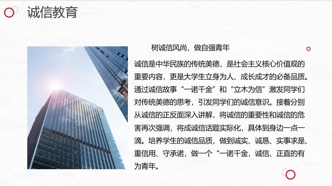 最后开展了线上诚信宣誓活动,倡议学生:树立诚信风尚,做自强青年,立诚信身、做诚信人、践诚信事、交诚信友,做新时代诚信大学生,让诚实劳动、服务社会、诚信交往成为青春最靓丽的风景线,以实际行动回报社会,将诚信进行到底。