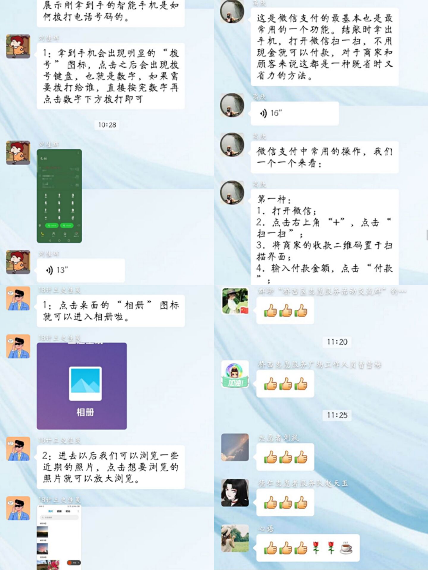 考虑到父母们的学习效率与适应能力,志愿服务队提前两周进行策划、筹备,制作视频与讲解稿,提升服务效能。从拨打电话号码、微信支付的使用、手机拍照和修图三个板块进行介绍,通过录制操作视频、截图示意、文字注解等方式进行详细讲解,如微信支付的使用分为购物支付、收发红包、查看余额与历史记录三部分,简洁易懂的介绍获得了其他负责人与志愿者的认可与好评,有效帮助社区居民更好的使用手机,同时有更多社区向志愿服务队发来活动邀请,“人工智能AI 筑梦促成长”志愿服务队也将以倾情服务践行使命。
