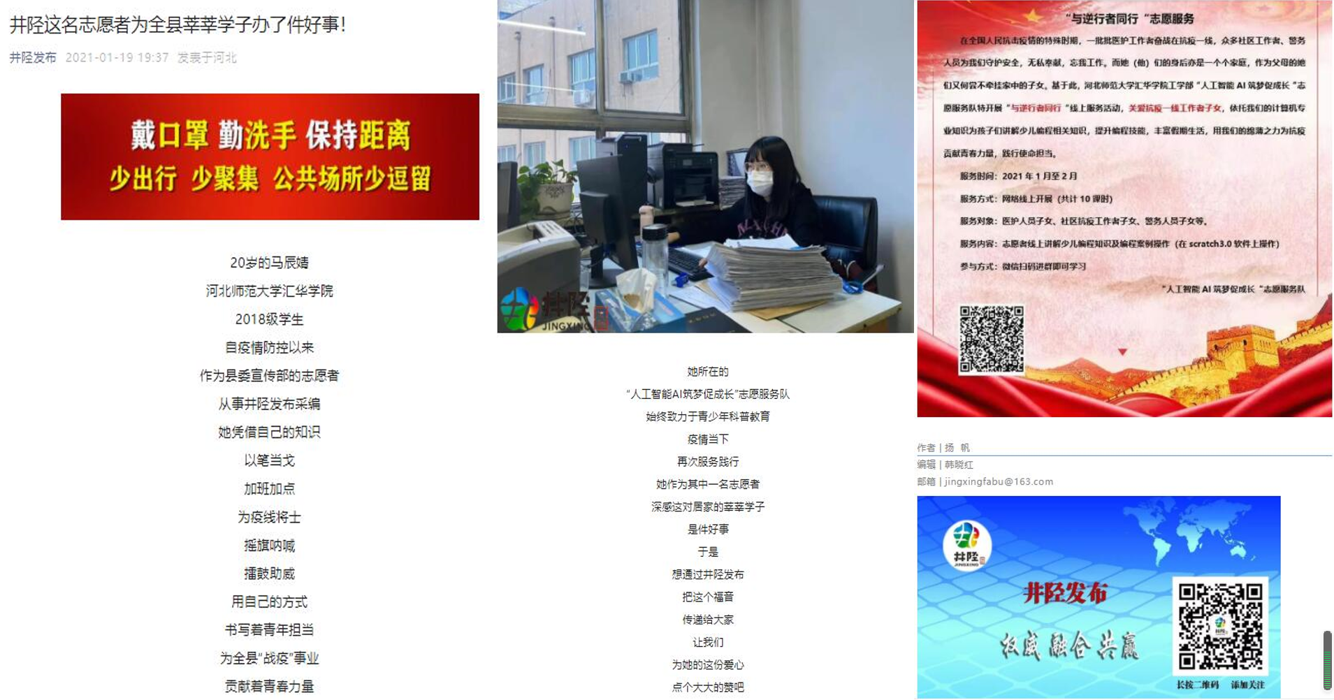 本次志愿服务得到师生党员积极响应,“人工智能AI筑梦促成长”志愿服务队的小队员们更是踊跃参与,广泛宣传。工学部2018级计算机科学与技术专业马辰婧同学,她作为服务队新闻部的一名志愿者,自疫情防控以来积极参与井陉县委宣传部文字采编工作,凭借自己的知识,以笔当戈、加班加点,为疫线将士摇旗呐喊、擂鼓助威,用自己的方式书写着青年担当,为井陉全县“战疫”事业贡献着青春力量。同时她更是通过“井陉发布”把“与逆行者同行”志愿服务传递给井陉地区莘莘学子,这份爱心被“井陉发布”官方媒体报道称赞。