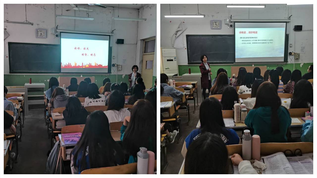 黄文艳通过讲解学生们耳熟能详的毛泽东诗词,提出“诗史合一”的理念,从而引导学生深刻了解党史、学习党史。她从毛泽东所经历的求学探索、抗日战争、解放战争到最后的新中国成立谈起,强调其凝聚着伟大历史成就的经典著作是中国革命画卷中的浓墨重彩。随后根据时间顺序展示了毛泽东的不朽经典著作,从《沁园春•长沙》、《菩萨蛮•黄鹤楼》到中华人民共和国的第一个国庆日写下的《浣溪沙•和柳亚子先生》,让同学们在欣赏伟人风采的同时,了解党史知识,深刻认识党的初心和使命。在党课的最后,她要求同学们牢记“读诗、读史、明智、明志”的真正内涵,强调无论在学习中还是在人生旅途中,都要多读诗词、史诗提高人生阅历和做事能力,努力达到“知过往、见未来”的人生境界!