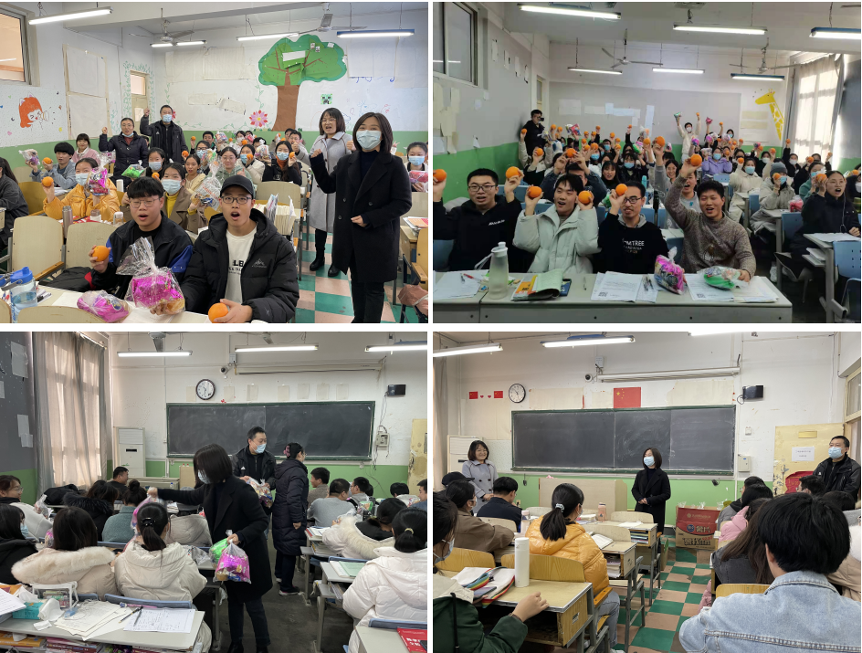 黄文艳老师首先代表学院和学部表达了对考研同学的美好祝福,鼓励大家坚定信心,争取最后胜利。之后便是令人激动的的送慰问品环节,老师们将精心准备零食小礼包和寓意着“脐”开得胜、马到“橙”功的脐橙等礼物分发给大家,祝愿大家考研顺利。简短的送温暖活动在师生高喊的“脐”开得胜、马到“橙”功的口号中圆满结束 。