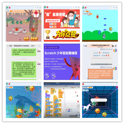 编程技术广分享,多师聆听共奋进。立足青少年编程教育,为了推动形成新时代文明实践科普合力,扎实做好科技志愿服务工作,更广泛的服务于民、惠及于民,党员教师代表于桥西区新时代文明实践志愿服务活动群、小学教师及幼师交流群为750余名幼师、小学教师、家长、学童进行《少年轻松趣编程——用Scratch创作自己的小游戏》科普分享,涵盖小勇士大战病毒怪、小勇士射击病毒怪、小飞马狂吃病毒怪、体感疯狂大战病毒怪、疫情防控智慧问答等编程游戏作品,进一步与群友交流探讨了“青少年编程教育的发展与探索”,团结带领一线教育工作者服务群众、服务学生。