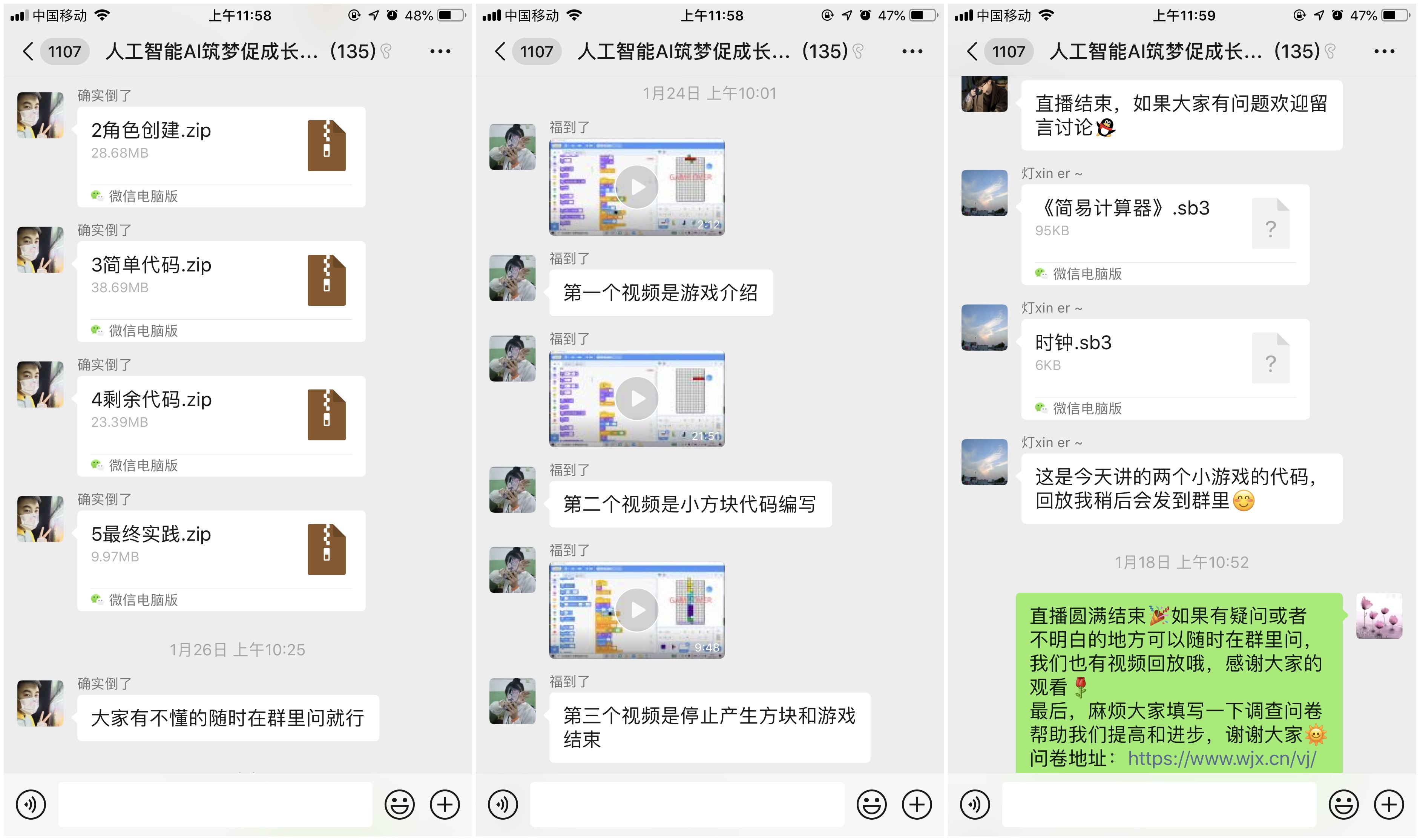 线上讲座稳推进,远程服务践初心。服务队在响应防疫政策、配合科学防治的同时,依托人工智能AI筑梦促成长志愿服务微信群打造出一个疫情当下也能广泛学习的“大后方”。自2022年1月份以来,志愿者们先后通过线上直播、视频录播、实践答疑等方式进行Scratch科普服务5期,涵盖贪吃蛇游戏、简易计算器与时钟、黄金矿工游戏、俄罗斯方块游戏、谣言与真相问答等多个Scratch编程游戏案例的创作,让青少年通过动手操作与亲身体验感受编程技术的魅力和神奇,在渗透科技素养中,进一步弘扬抗疫精神、厚植爱国情怀。