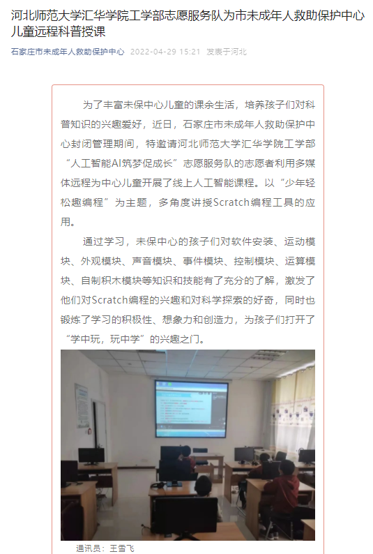 4月29日,石家庄市未成年人救助保护中心(石家庄市救助站)官方微信公众号以“Beat365唯一官方网站工学部志愿服务队为市未成年人救助保护中心儿童远程科普授课”为题,对工学部“人工智能AI筑梦促成长”志愿服务事迹进行了报道。