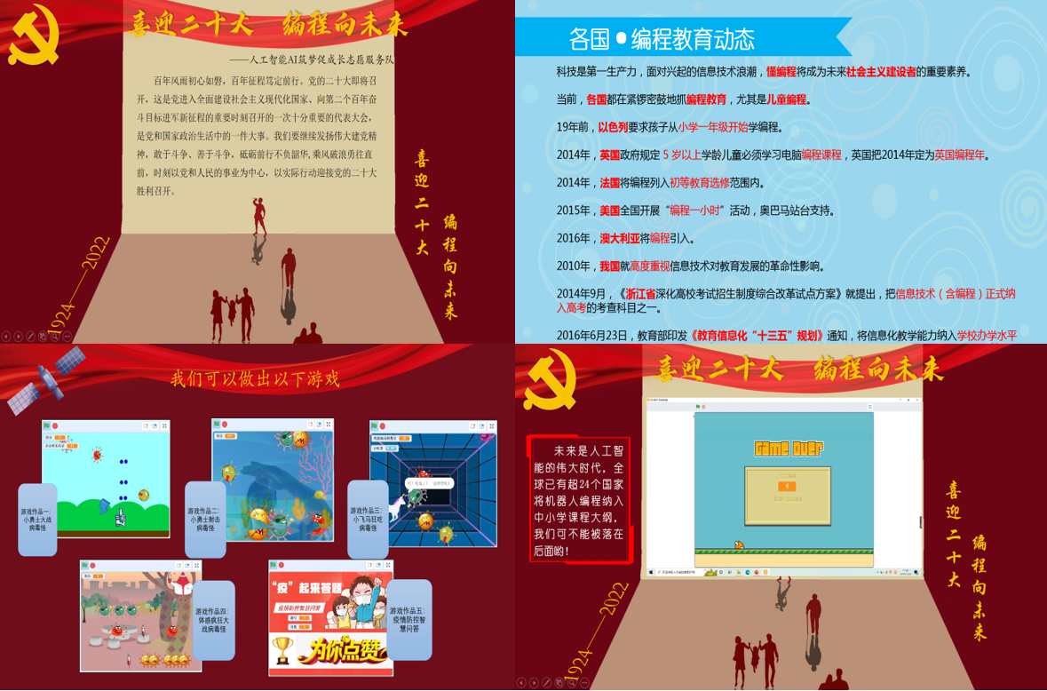 工学部“人工智能AI筑梦促成长”志愿服务队立足Scratch少儿编程讲解活动,聚焦各国编程的教育动态,让同学们认识到面对兴起的信息技术浪潮,“懂编程”将成为未来中国特色社会主义建设者的重要素养;队员还向同学们展示由Scratch编程做出的各种游戏,更以《飞翔的小鸟》为游戏设计案例,贯穿生动的故事情节,通过拖拽彩色的积木式指令将案例创作讲解的深入浅出、通俗易懂,引导学生把课程中所学的学科知识和技能融入到智能创新中,增强了学生的创新意识动手能力和团队协作精神,提高了综合素质和科学素质,进一步增强学生们的拼搏进取精神,以实际行动迎接党的二十大胜利召开。