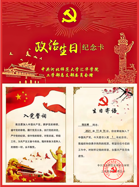 工学部党总支精心制作出的一张张政治生日贺卡,撰写着醒目的入党誓词,标注着入党时间和党龄,记录着温馨的生日寄语,承载着满满的祝福与期望,唤起工学师生党员对理想信仰的虔诚执着、至信深厚。党总支书记段再超通过各党支部向师生党员发出号召,携手立足本职,为师生办实事,切实将入党誓词嵌入思想,将入党初心注入灵魂,将使命担当融入血脉,政治生日忆初心,牢记身份葆本色。