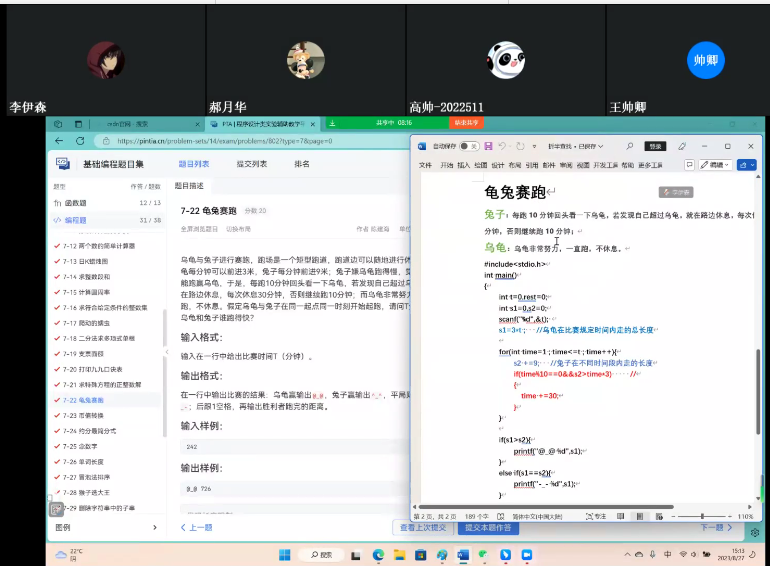 首先,由“暑期程序设计能力提升训练营”相关负责同学介绍了此次交流活动的目的和意义。然后由2022级计算机科学与技术专业的郝月华、尚真卿、张慧等六位同学分享了自己对一些编程题目的解题思路,六位同学前期通过征集同学们的意见,针对暑期打卡的难点题目、部分同学普遍存在问题的题目进行了仔细讲解。最后C语言程序设计竞赛的获奖学生李伊森和孙研哲对2022级同学给出了一些学习C语言的建议。