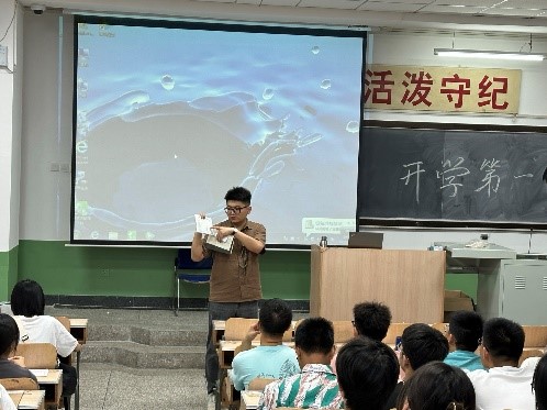 会议宣传与要求并举,王一凡主要从安全意识教育以及校规校纪教育两方面对新生行为进行规范与引导。通过举案例、看视频的形式与新生互动,开展人身安全、交通安全、财产安全、消防安全、网络安全等教育,宣传普及防范电信诈骗、校园霸凌等方面的安全知识和技能,运用典型案例敲响警钟,教会学生应急处理方法,增强大学生的安全防骗意识。同时组织新生学习《学生手册》的内容,深入学习学校规章制度,将其内化为学生自我规范、自我约束、自我管理的意识和纪律观念,进而外化为行为规范。