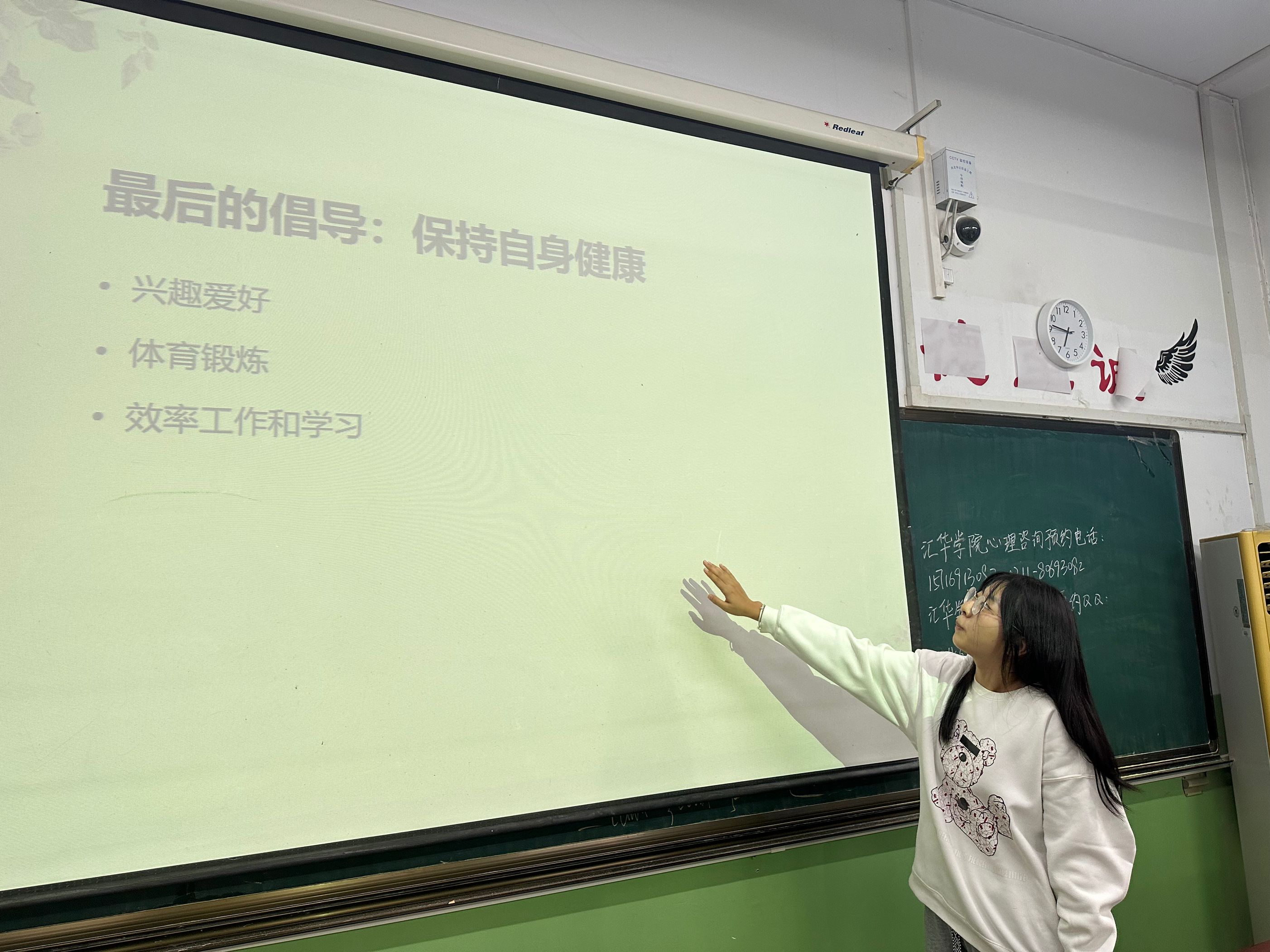 刘璇同学言简意赅地讲解了大学生常见的心理困惑,接着引入生动典型的事例与同学们积极互动,从情绪变化、行为变化、人际交往、创伤事件等方面出发带领同学们认真分析焦虑产生的原因,进行生命教育,解读生命的意义,帮助同学们树立正确的生命观,引导大家了解生命、感受生命、珍爱生命,树立远大理想,掌握保持健康心理的方法,勇于面对生命中所遭遇的种种挑战,以积极阳光的心态面对学习与生活。