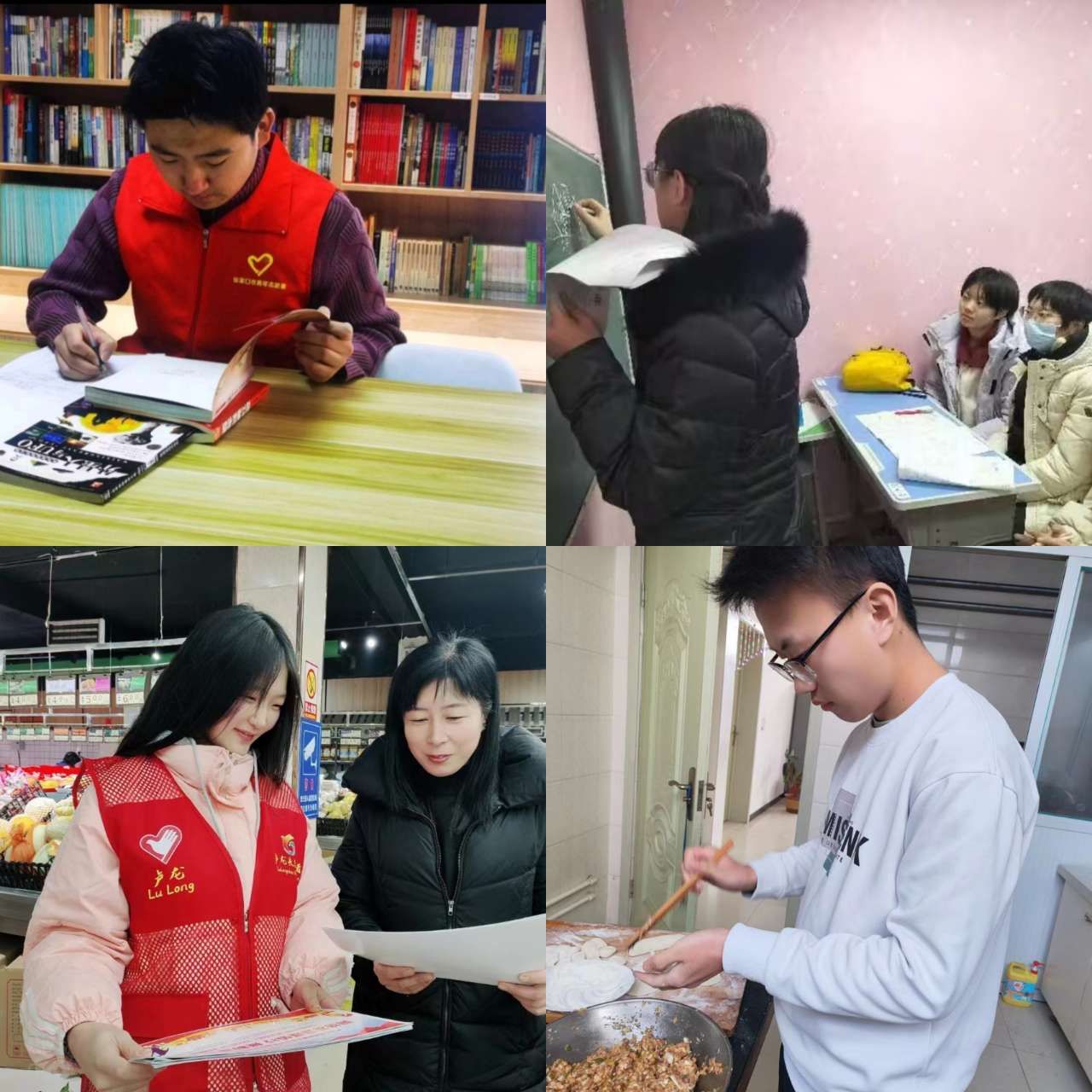 “老师,您看这道题怎么解?谢谢老师,老师辛苦了。”刘佳洁回到家乡,利用寒假期间义务助学,担负起教书育人的责任。桃李不言,下自成蹊。她用自己所掌握的知识,帮助学生们实现他们的梦想;王文菁同学积极参与到张家口市慈善义工联合会组织的图书捐赠活动中,登记热心市民和企业捐赠的图书。有附近居民一本一本捐来的书籍,也有附近书店捐赠的几十本新华字典,志愿者一一登记,为社区义工活动增添了自己的力量;同学们积极响应学院团委大学生寒假返乡志愿服务活动的号召,积极主动投入家乡的社会实践中,为自己的家乡贡献力量。其中王梦琳同学寒假期间在秦皇岛市卢龙县下寨乡人民政府党建办公室进行社会实践,担任宣传办干事一职;马宇轩积极参与社区卫生清洁志愿服务活动;曲佳怡、杨依凡同学,利用所学专业技术,在小黑课堂从事计算机二级辅导,用自己的专业技术服务更多学生。其他同学也在年节中参与到“忙年”的年俗活动和家务劳动中,做自己力所能及的事情,如做年夜饭、贴对联、包饺子等,学习并锻炼了一系列独立生活技巧,为父母家人奉献出自己的爱心和热情。