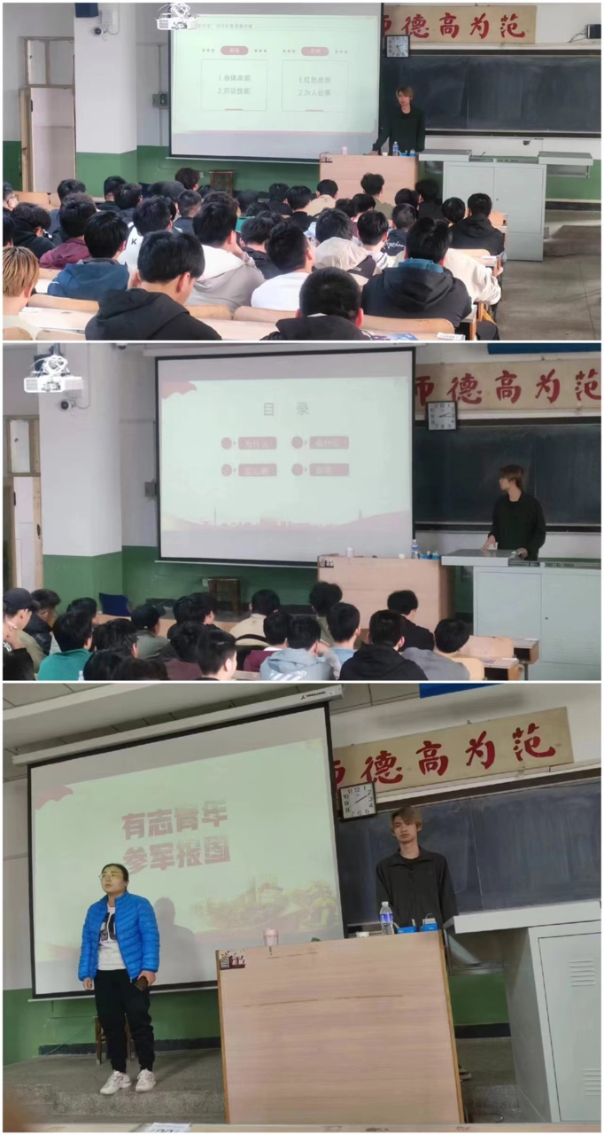 趁青春,去当兵。“有志青年从军建功,热血男儿矢志报国”,崔骏豪以《有志青年,参军报国》为主题,从为什么当兵、当兵需要做什么、怎么做三个方面进行详细介绍,以一名大学生成长为一名优秀士兵的心路历程,向同学们介绍了部队的精彩生活,打破了同学们对部队生活枯燥和乏味的印象,鼓励青年学子积极投身军旅,迎难而上,主动迎接挑战,锻炼身体,锤炼意志,以矢志不渝的决心,成长为一名优秀的军人,完成军人的使命,在军营里建功立业。