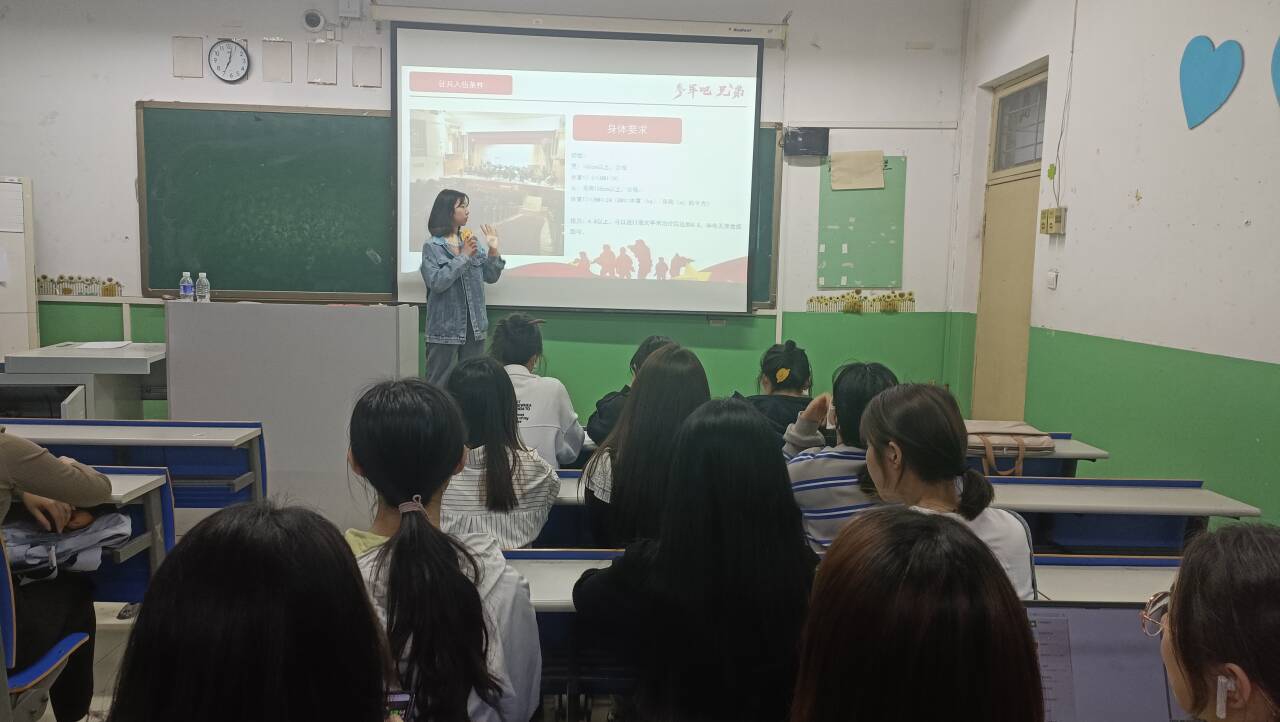 为展巾帼英姿,进一步激发学生从军报国热情,营造“关心国防、热爱国防”的浓厚氛围,4月11日,工学部在第一教学楼316教室举办了“巾帼展英姿,使命永传承”优秀退役女兵应征经验交流会。会上邀请到了文学部2021级汉语言文学2班的优秀退役女兵孟宋侠。