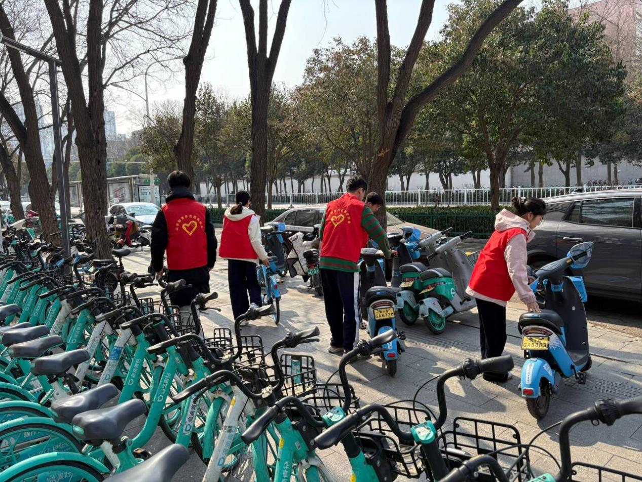 在活动现场,学生们身着统一的志愿者服装,有条不紊地将随意停放的车辆进行规范停放,按照朝向一致的标准整齐排列。在他们的不懈努力下,原本杂乱无章的停车区域瞬间变得井然有序,面貌焕然一新。