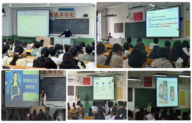 活动期间,老师们各展所长,为师生带来丰富实用的AI知识。魏娜娣老师带来的“AI赋能就业季”,深度解析如何构建求职智能导航系统,帮助学生利用AI优化简历、模拟面试,在就业竞争中脱颖而出;霍利岭老师的“提示词工程”,带领师生探索如何精准使用提示词,解锁AI工具的强大功能;赵琛老师分享的“AI四级备考法”,将AI技术融入英语四级备考,提供智能学习规划与高效复习策略;陈雪老师的“AI智能体成长魔法”,揭开AI智能体的神秘面纱,讲解其构建与应用技巧;吕晓晴老师的“校园智能达人指南”,引导学生借助AI工具提升校园学习和生活效率,成为校园智能达人。