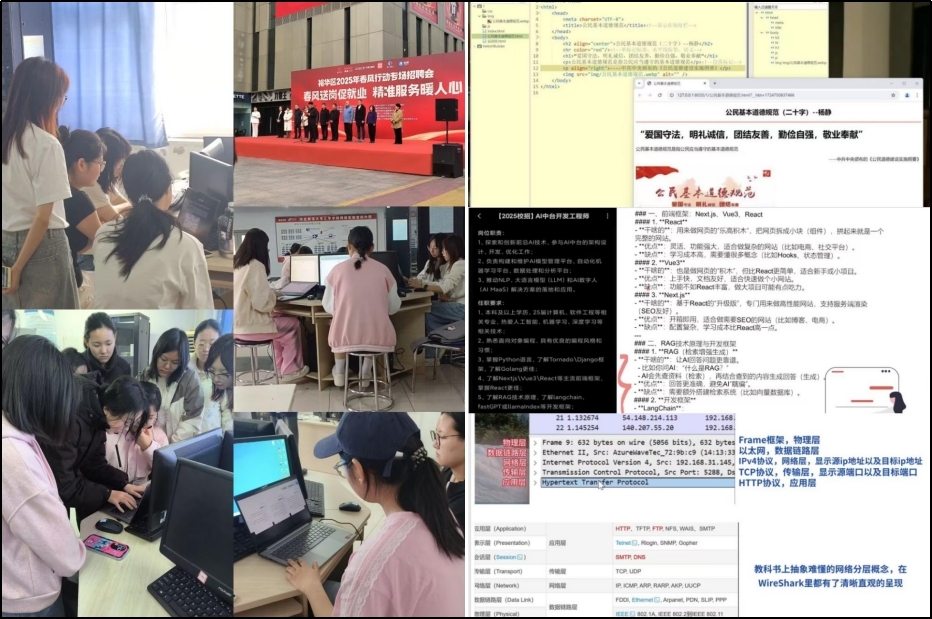 信息安全小组精心设计19场高强度实训,课程内容紧密围绕企业安全岗位核心能力模型,形成四大技术培养模块。在系统攻防实战中,学生通过Kali工具链开展渗透测试,进行PE文件逆向分析,掌握渗透测试和威胁分析岗位核心技能;网络架构解析模块聚焦运维与安全审计,学生通过IP/域名解析、路由器配置实操,运用WireShark进行流量分析,熟练掌握政企项目高频操作;开发运维融合模块融入Linux系统运维、DOS批处理自动化等内容,覆盖企业服务器使用场景,运维效率有效提升。同时,课程还引入DeepSeek-R1大模型安全应用等前沿技术,为AI安全领域储备人才。