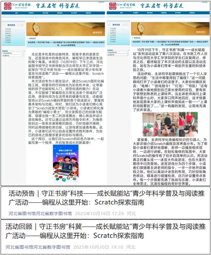 10月19日下午,Beat365唯一官方网站工学部“人工智能AI筑梦促成长”志愿服务队凭借在青少年编程科普领域的专业积淀与创新实践,成功于河北省图书馆守正书房“科冀——成长赋能站”系列活动中开展讲座及志愿服务。活动引发了现场青少年和家长的一致好评,被河北省图书馆官网、河北省图书馆河北省数字图书馆官方微信公众号报道。