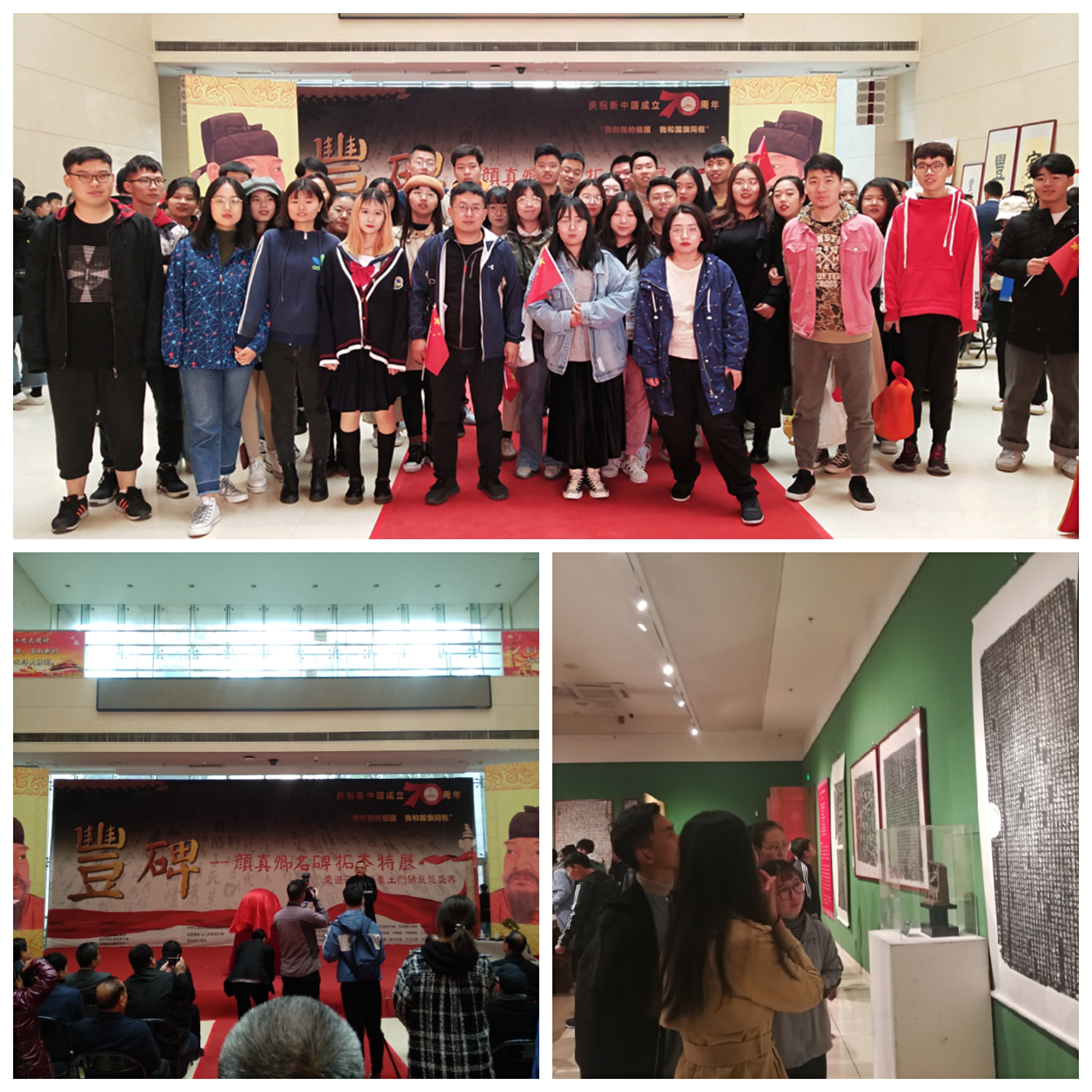 10月18日上午,由河北日报报业集团、陕西西安叁和美术馆等单位主办的“庆祝新中国成立70周年《丰碑-颜真卿名碑拓本特展》”在石家庄美术馆隆重举行。艺术学部书法学专业2017/2018级全体学生在王彦杰、宗宏宇老师的带领下参观了本次展览。