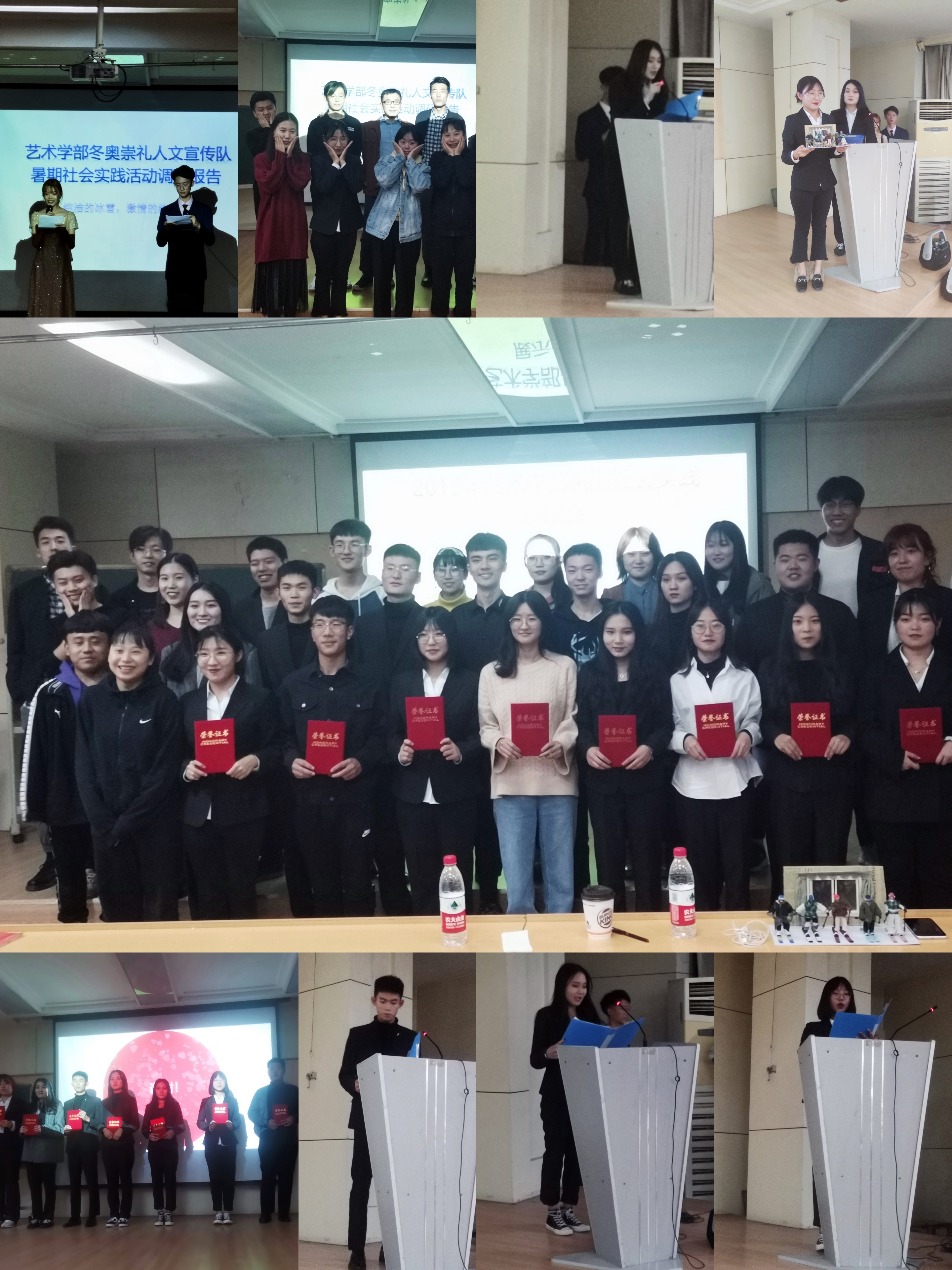 随着一阵阵掌声,比赛正式开始,各支参赛队伍纷纷上台展示其实践成果。艺术学部冬奥崇礼人文宣传队,以“冬奥就在我身边”为题制作定格动画、设计冬奥徽章。之后上台的实践队有艺术学部小城同乡队、“九仙女”实践队、“夏天之行”实践队、古城同乡队、“bulingbuling”同乡队、“一起动起来”实践队、唐山风采小队。他们分别在藁城宫灯博物馆、邯郸丛台、正定大佛寺、唐山市区、定州博物馆、北京故宫等地围绕“新中国成立七十周年社会变化”“地方历史人文考察”等多个实践主题展开暑期社会实践调研,影响广泛。
