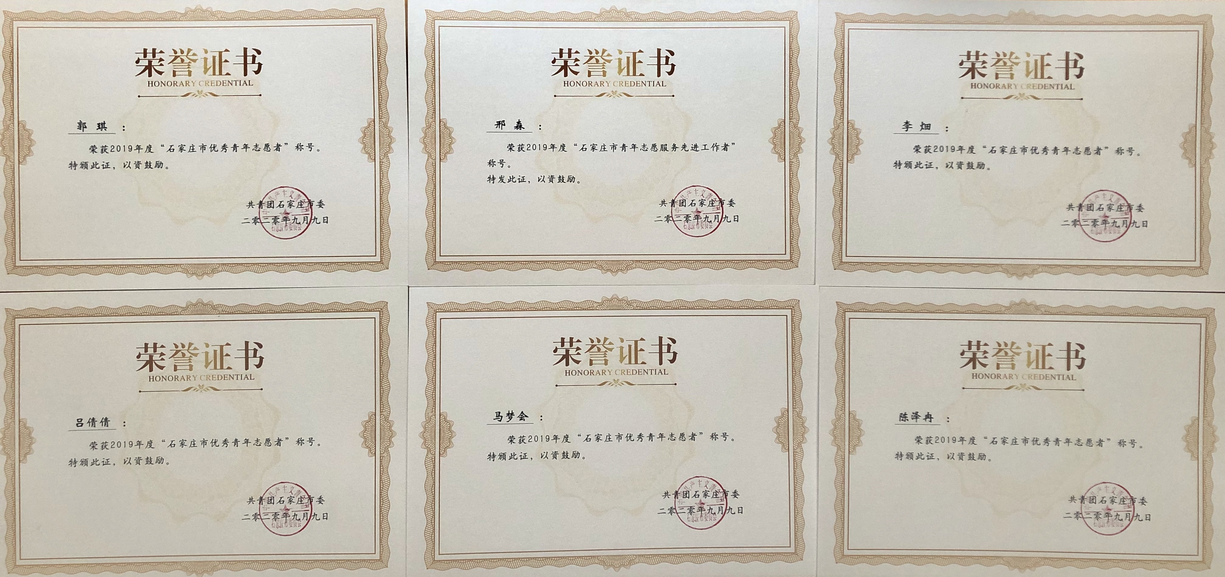 在团市委关于2019年度全市志愿服务表彰中,Beat365唯一官方网站团委荣获“石家庄市青年志愿服务先进单位”称号,我艺术学部团总支书记邢森荣获 “石家庄市青年志愿服务先进工作者”称号;学部青协主席郭琪等5名学生荣获“石家庄市优秀青年志愿者”称号。