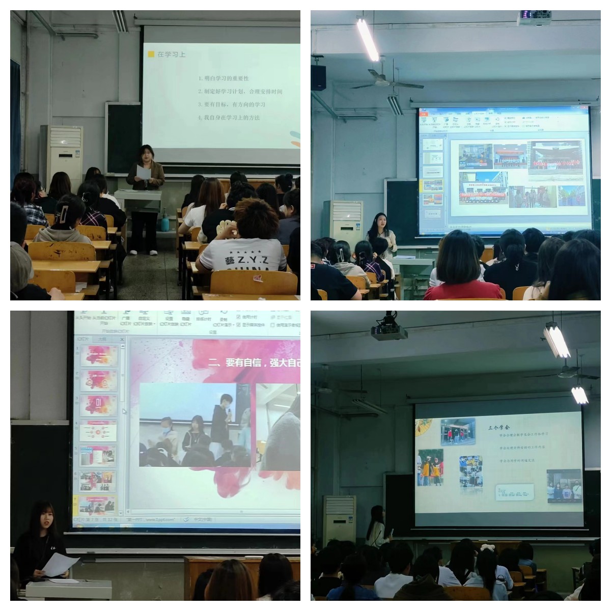 崔欣雨,从班干部的角度切入宣讲主题,对如何提升自己与时间安排服务同学等方面做出分享。周向南以个人志愿服务经历为契机,分享自我价值观,传递志愿者工作无私奉献,传递爱心正能量。刘红旭从自我成长方面进行总结和反思,分享大学自我蜕变。李佳羽以责任感为切入点,谈及学习与工作如何平衡,怎样提升。在场同学表示,自己近期的疑惑原来也发生在学姐身上,学姐的讲解使我知道了如何摆正自己的位置、如何调整自己的心态,如何成为优秀的学生干部。