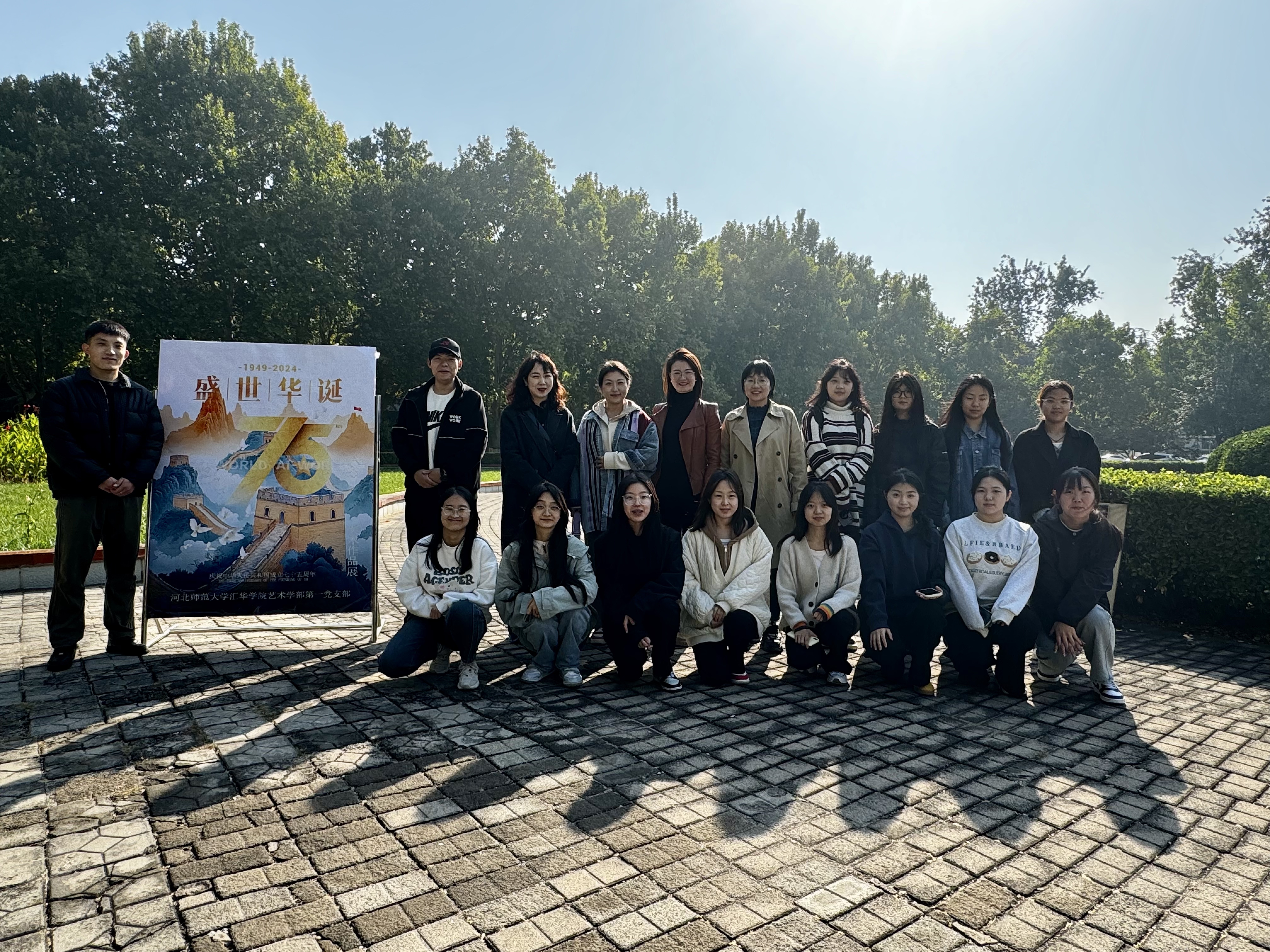 为歌颂伟大祖国,进一步激发师生爱党爱国情怀,艺术学部第一党支部于10月24日在沁芳园(图书馆西侧花园)举办了“盛世华诞”美术作品展。艺术学部部长秦笑笑、第一党支部书记张红娟、第一党支部部分师生参观了本次画展。
