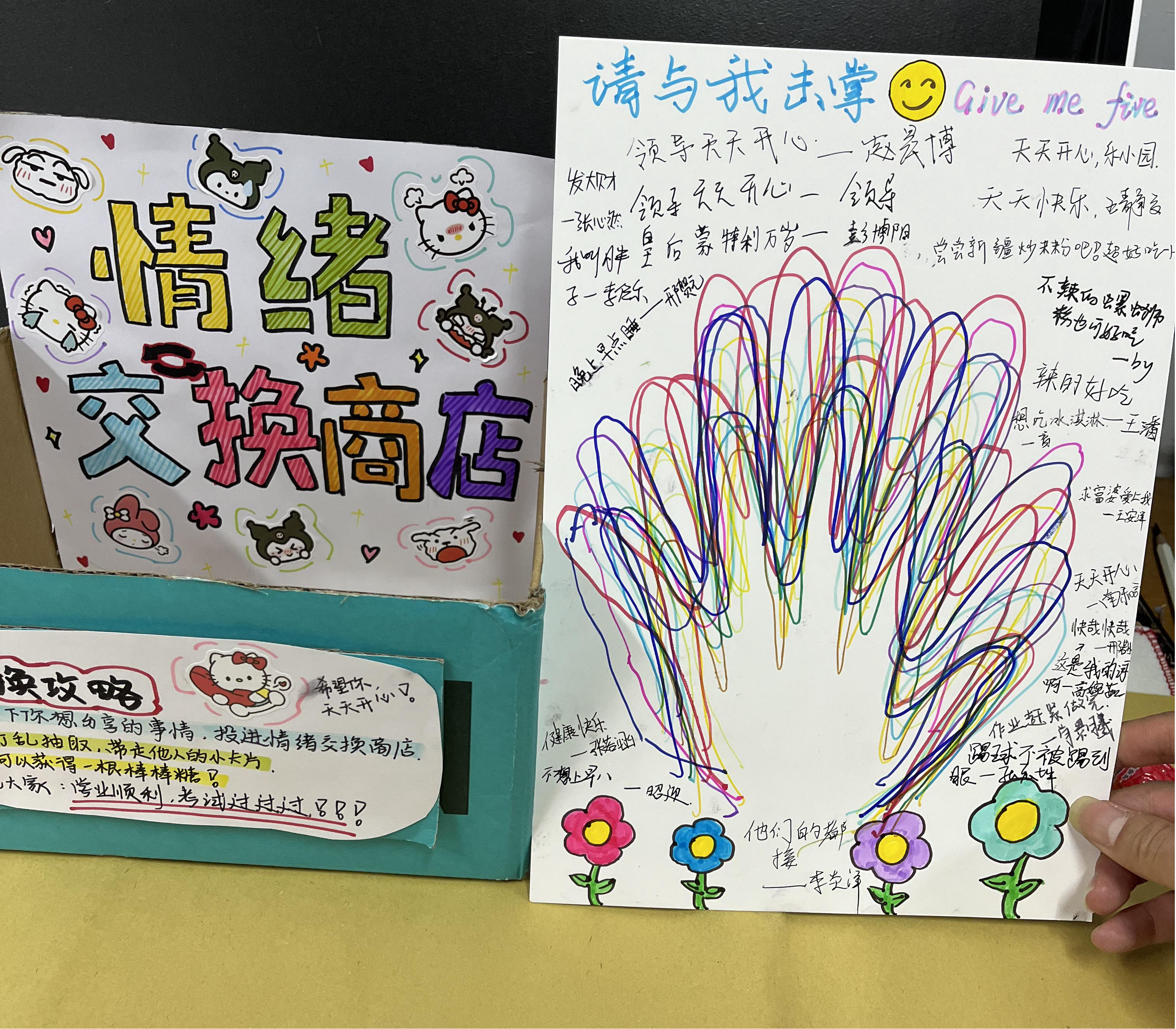 视觉传达设计1班:进行了“情绪交换商店”和“请与我击掌”活动。首先,同学们把自己想分享的事情写在便签上面,放进“情绪交换商店”,打乱顺序后由同学们随意抽取,同时获得一根棒棒糖。在甜甜的味觉感受中缓缓走进他人的内心世界,感受着他人分享的快乐。接着,心理委员组织同学们在一张纸上拓印手印,并写上激励的话语,手印相互叠加,代表着大家一起击掌,团结协作,互相加油。